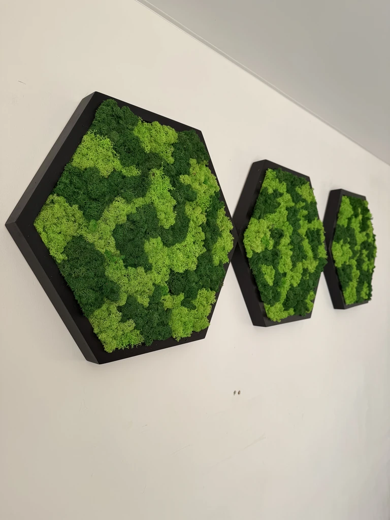 Hexagon Dekorativny Machový Obraz s Lišajníkom je špeciálne umelecké dielo, ktoré bude vyzerať krásne v rôznych miestnostiach domu. Môže byť napríklad dokonalým doplnkom do spálne, ktorá vyžaruje pokoj a relax. Upokojujúca zeleň machu vytvára upokojujúcu a bezstarostnú atmosféru.