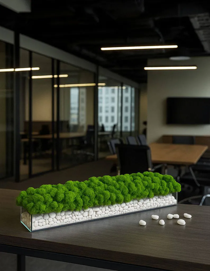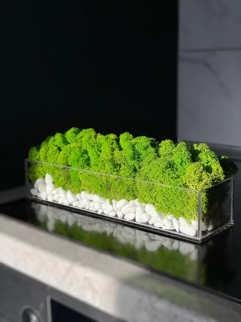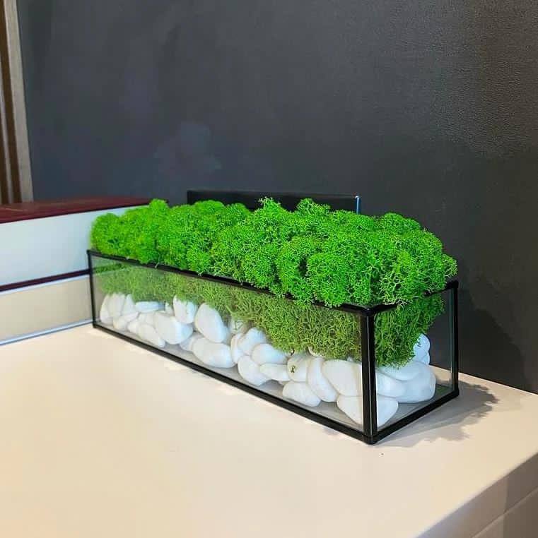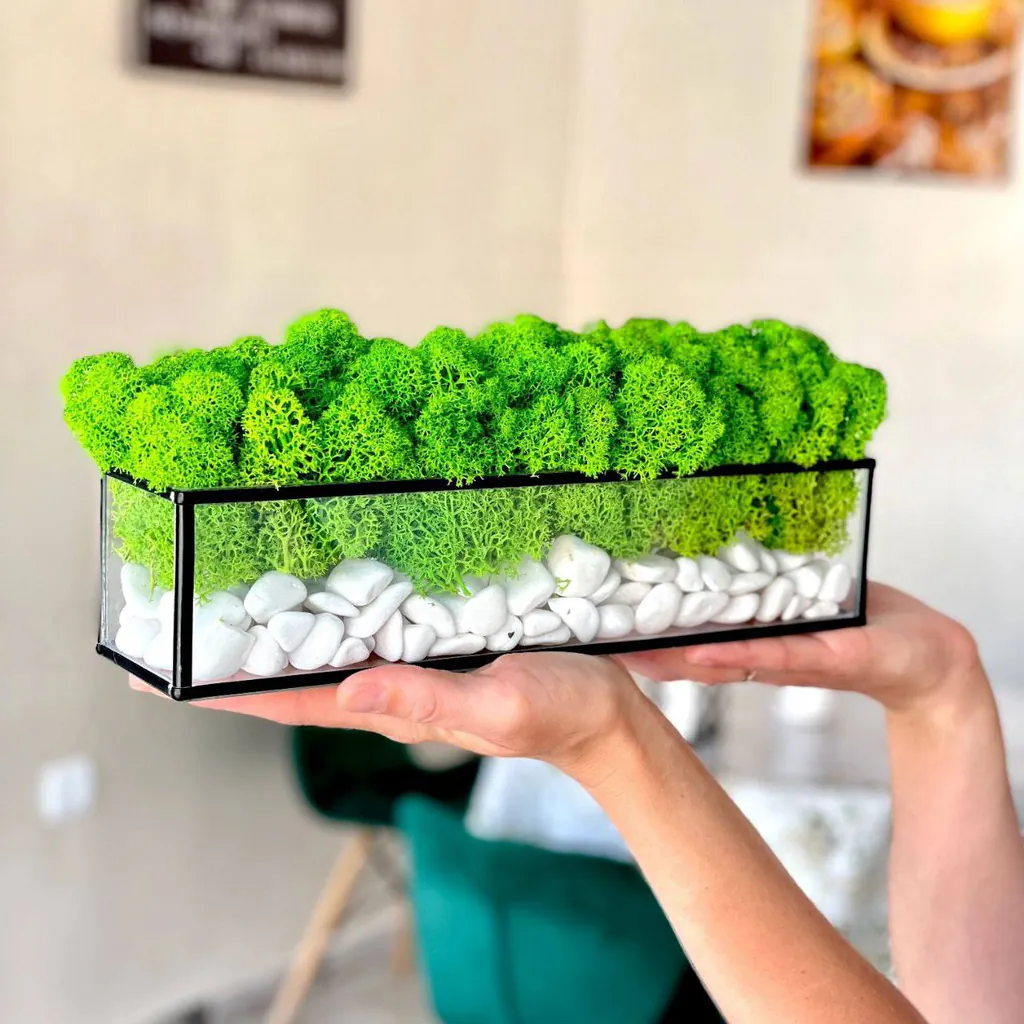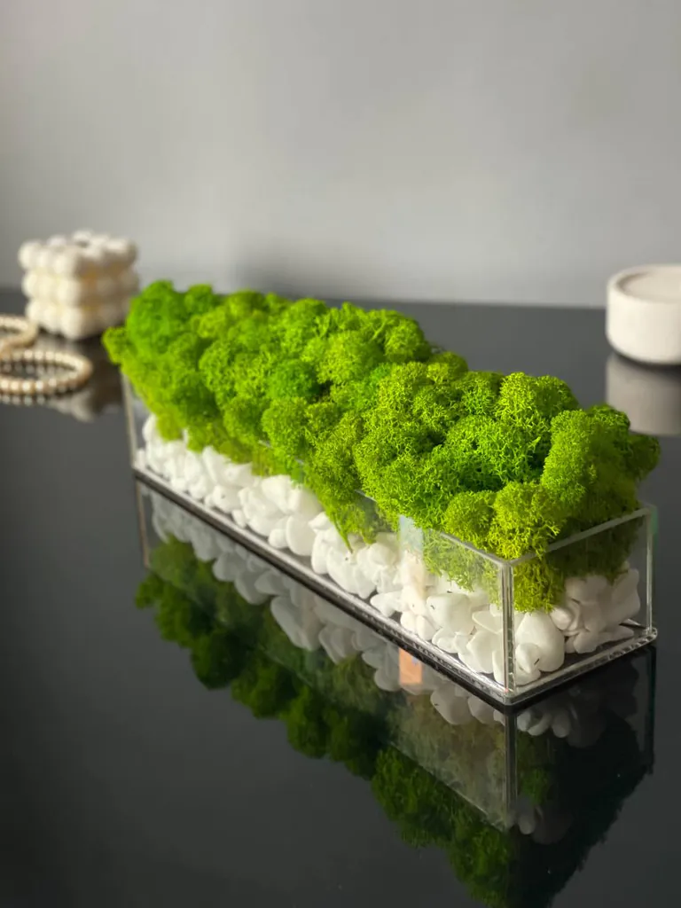 Každá sklenená nádoba je starostlivo vyrobená spoločnosťou Ekomoss, aby bola zaručená najvyššia kvalita. Čistý, obdĺžnikový tvar slúži ako pódium pre fascinujúcu optickú kompozíciu. Na dne nádoby sa nachádza vrstva žiarivo bielych, dekoratívnych kameňov, ktoré nielenže vytvárajú elegantný vzhľad, ale aj čistý, elegantný kontrast k zelenému machu. Táto sklenená dekorácia je viac než len bytový doplnok; je to malé umelecké dielo, ktoré spája estetiku prírody s modernou geometriou.