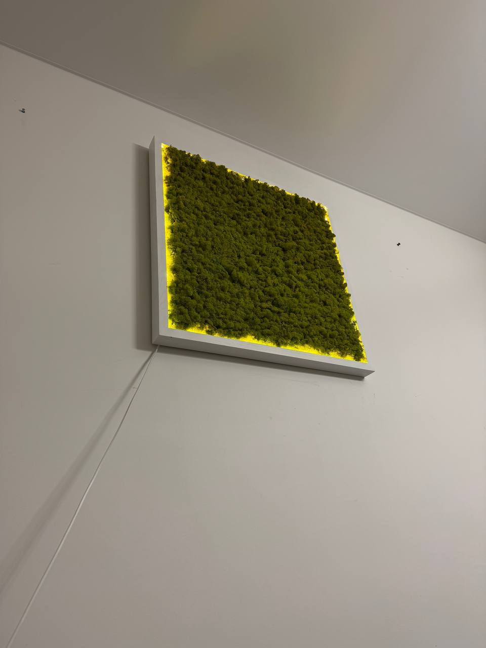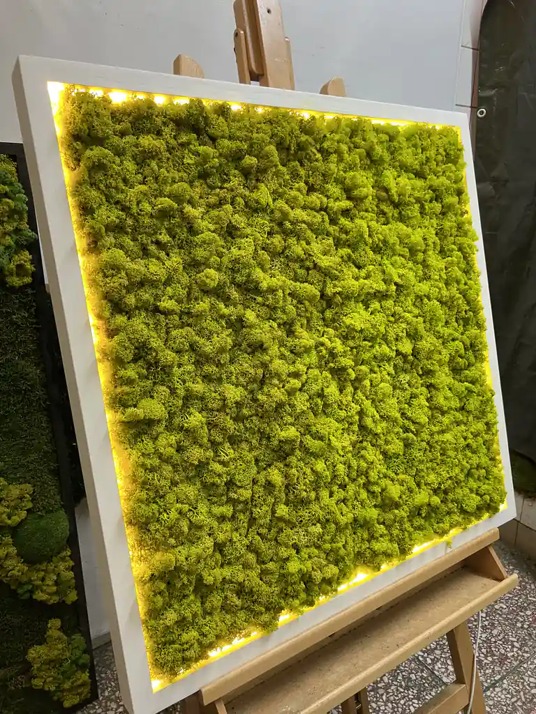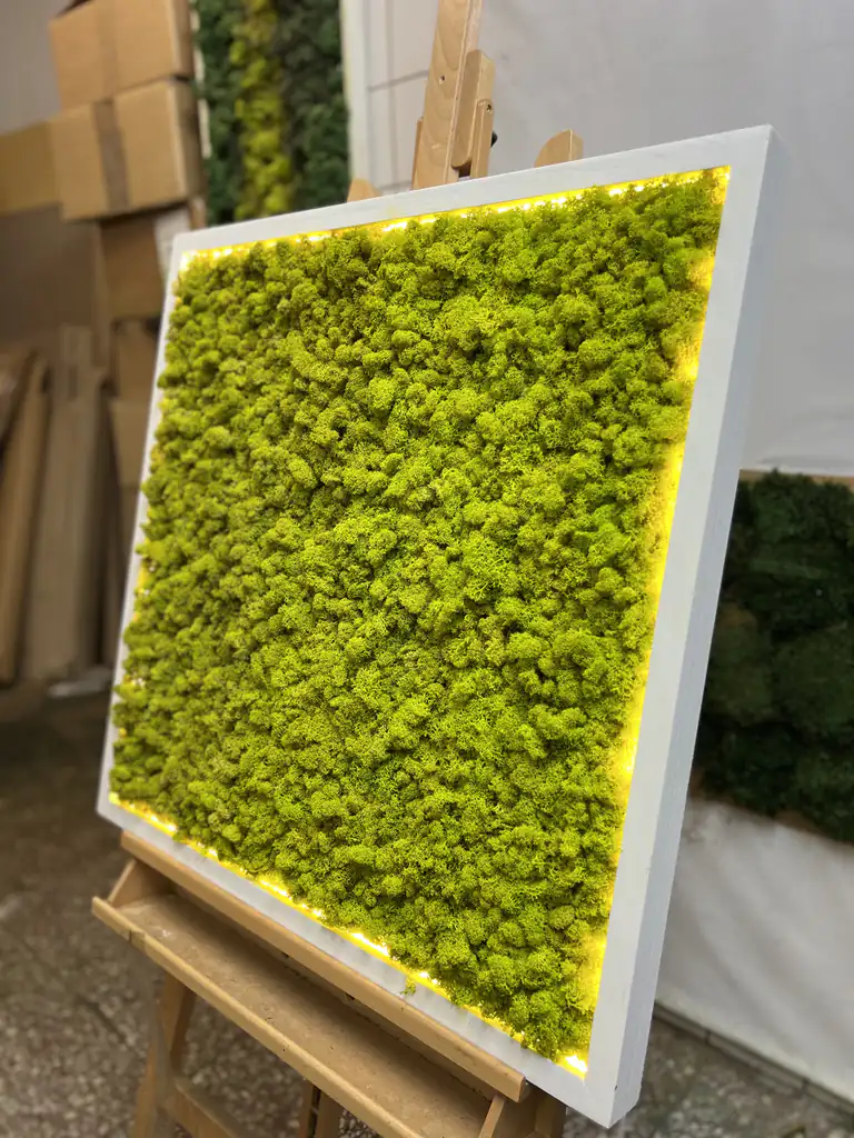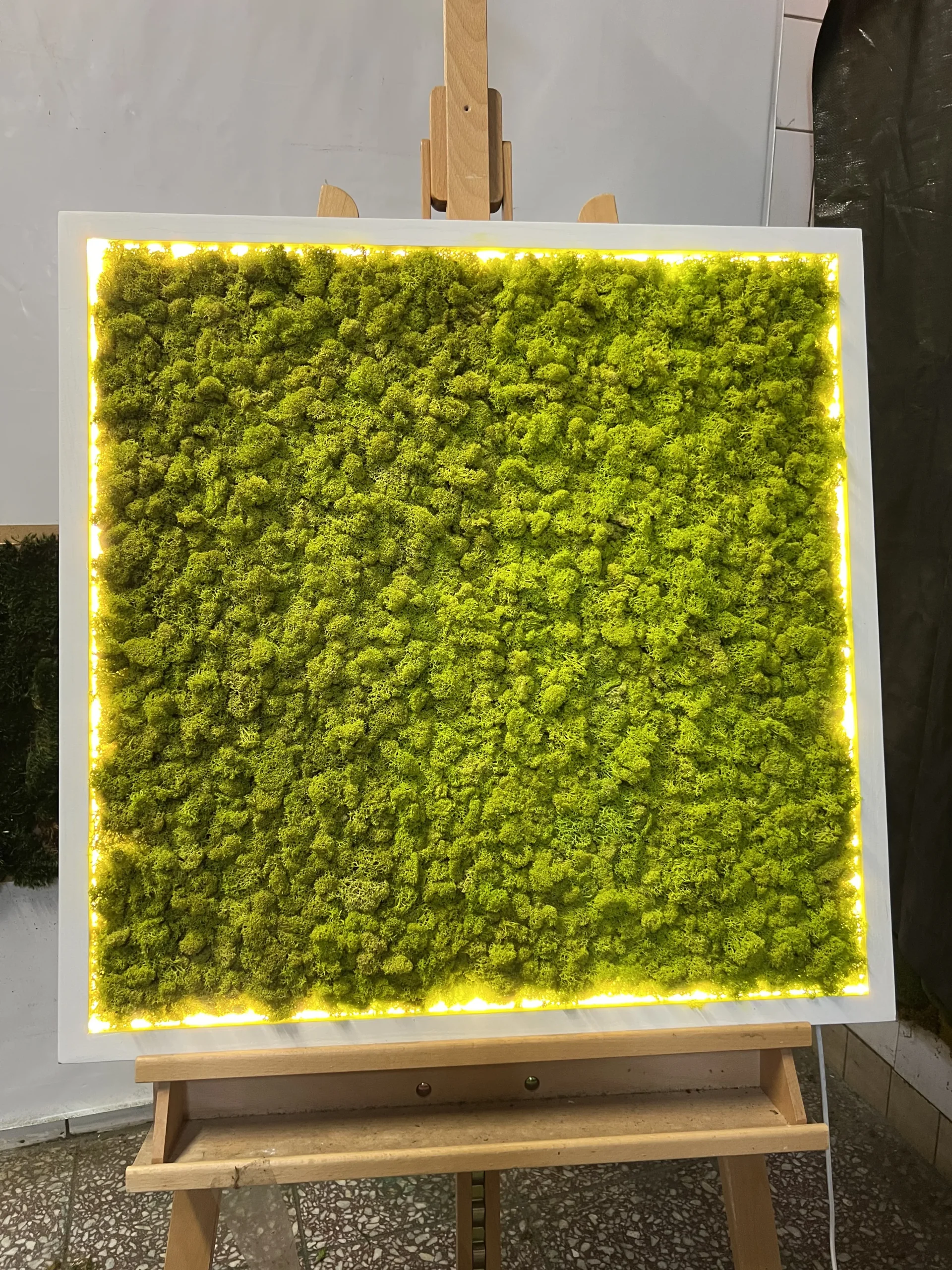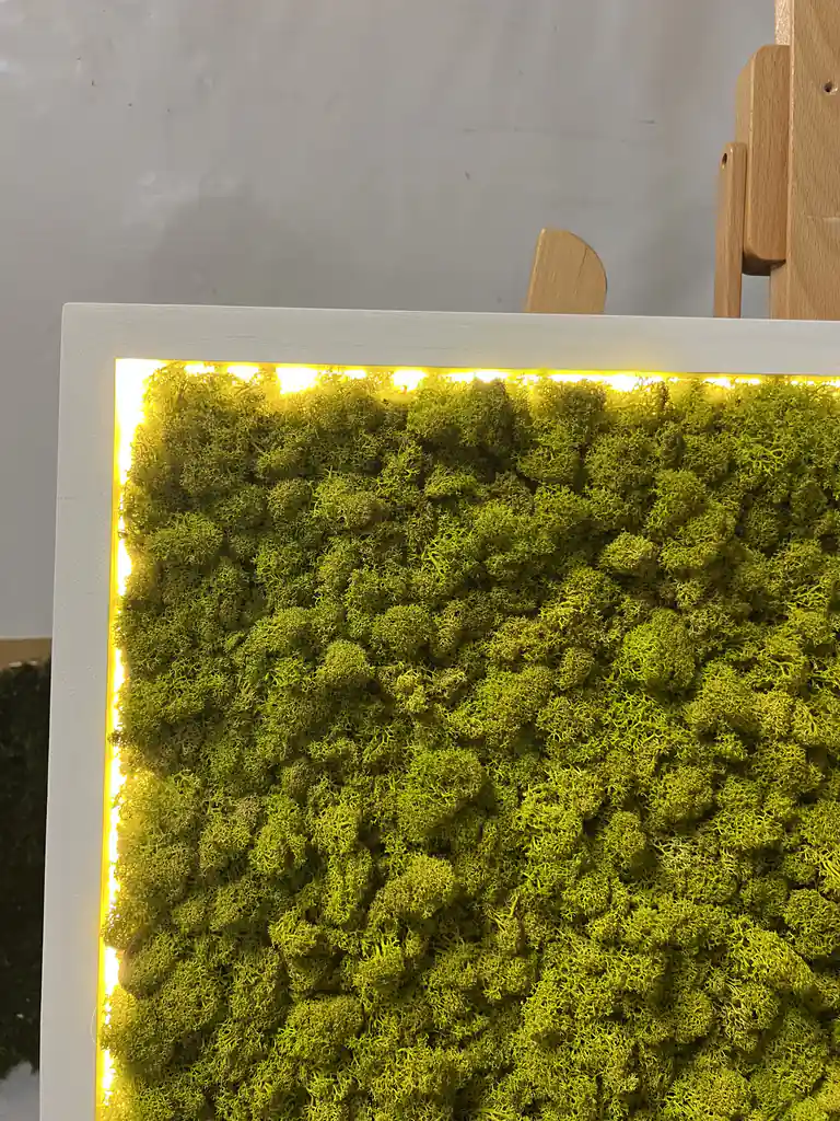 Obraz z machu s sobí machom a LED osvetlením je štýlový a moderný spôsob, ako vniesť prírodné prvky do vášho domova. Použitý sobí mach – známy aj ako sobí mach alebo lišajník – je stabilizovaný prírodný materiál s jemnou, filigránovou štruktúrou, dostupný v rôznych farbách. Kombinácia s integrovaným LED osvetlením vytvára fascinujúcu hru svetla a prírody, ktorá pôsobí pôsobivo počas dňa aj večera.