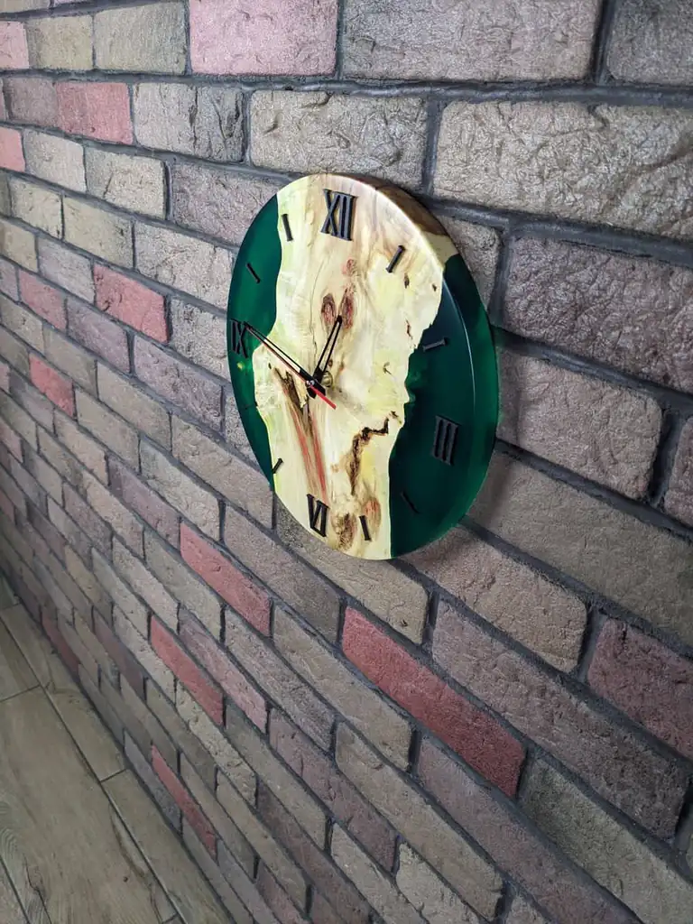 Nástenné epoxidové hodiny z javorového dreva so smaragdovo zelenou živicou – jedinečný dizajn pre váš domov