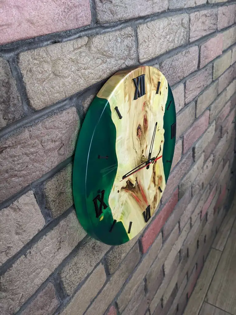 Nástenné epoxidové hodiny z javorového dreva so smaragdovo zelenou živicou