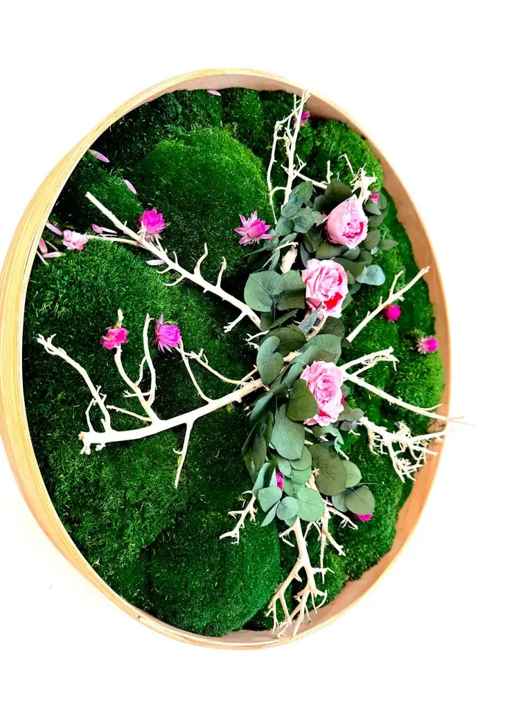 Oživte svoj interiér jedinečným prírodným obrazom, ktorý kombinuje krásu stabilizovaného machu a nežných ruží. Tento kruhový obraz je osadený v tenkom, elegantnom ráme z dubu alebo jasena a dostupný v rôznych priemeroch od 45 cm do 150 cm. Celá základňa je pokrytá bohatým Guľatým machom, medzi ktorým sa jemne vinú drevené konáre, zelené lístky a zachované ruže v jemných ružových odtieňoch.