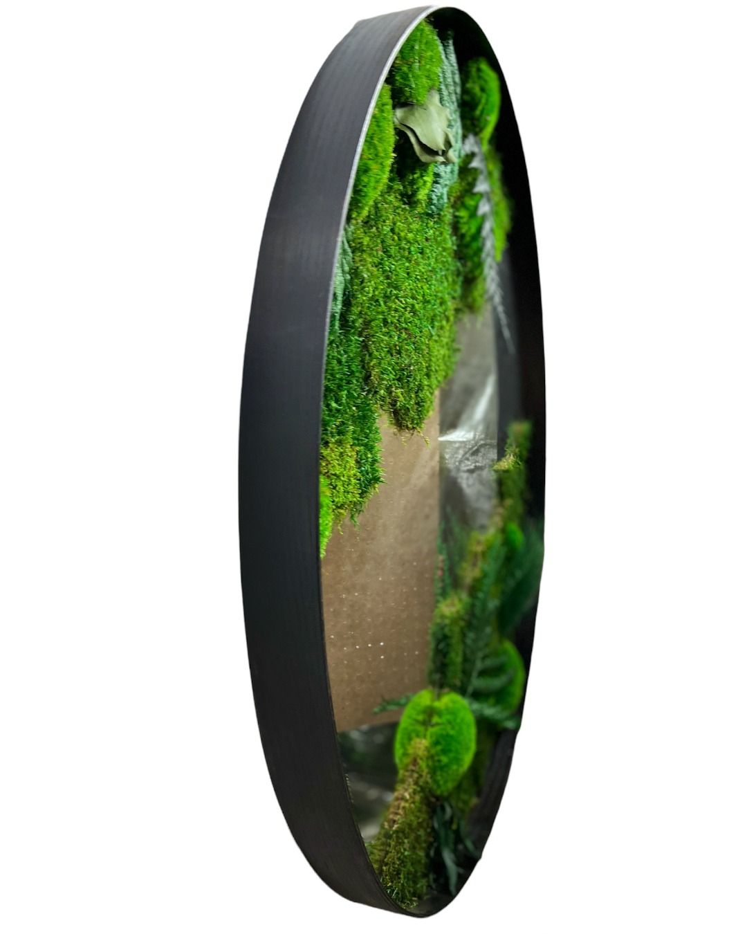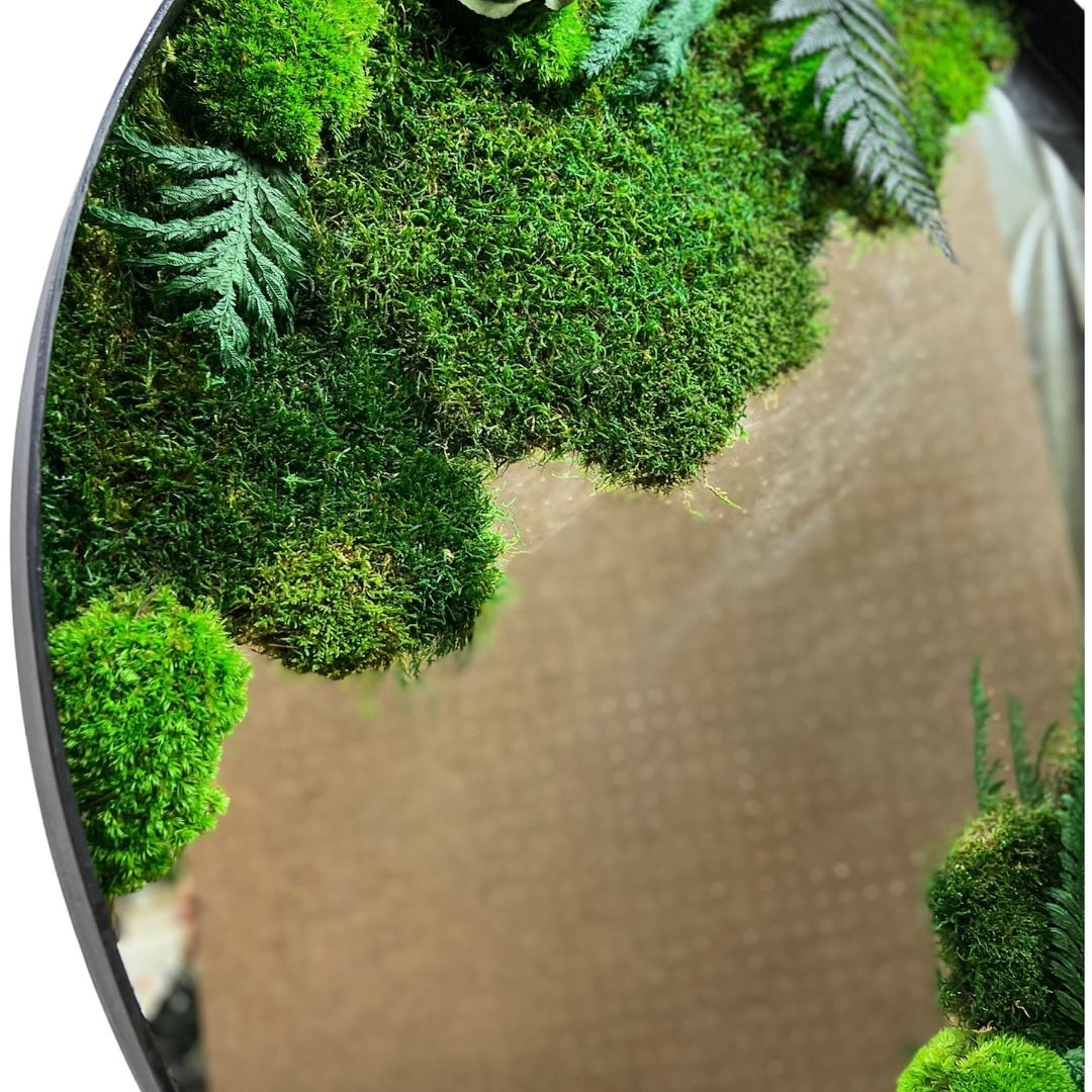 Machové zrkadlo so stabilizovaným plochým machom, Guľatý mach (Bolmoss), papradím a rastlinami.