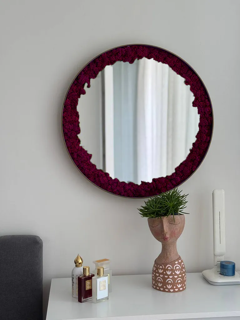 Okrem dekoratívneho účinku zrkadlo prináša aj praktické výhody: opticky zväčšuje priestor, odráža svetlo a vytvára otvorenú, príjemnú atmosféru. Nenápadný machový rám mu dodáva prírodný charakter, ktorý pôsobí upokojujúco a vyvážene.