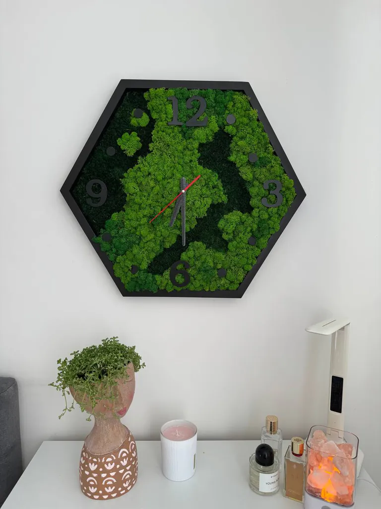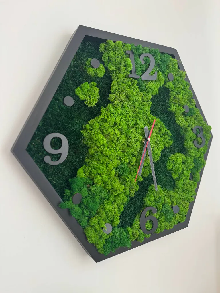 Tieto hexagonové machové nástenné hodiny, s kombináciou islandského machu a flatmossu, nastaviteľnými farbami rámu a ciferníka, ako aj tichým mechanizmom, sú oveľa viac než dekorácia. Sú prejavom osobnosti a úcty k prírode. Machový hexagon, ako machový obraz Hexagon s islandským machom a flatmossom, je udržateľným dizajnovým prvkom, ktorý jedinečným spôsobom spája funkčnosť a estetiku.