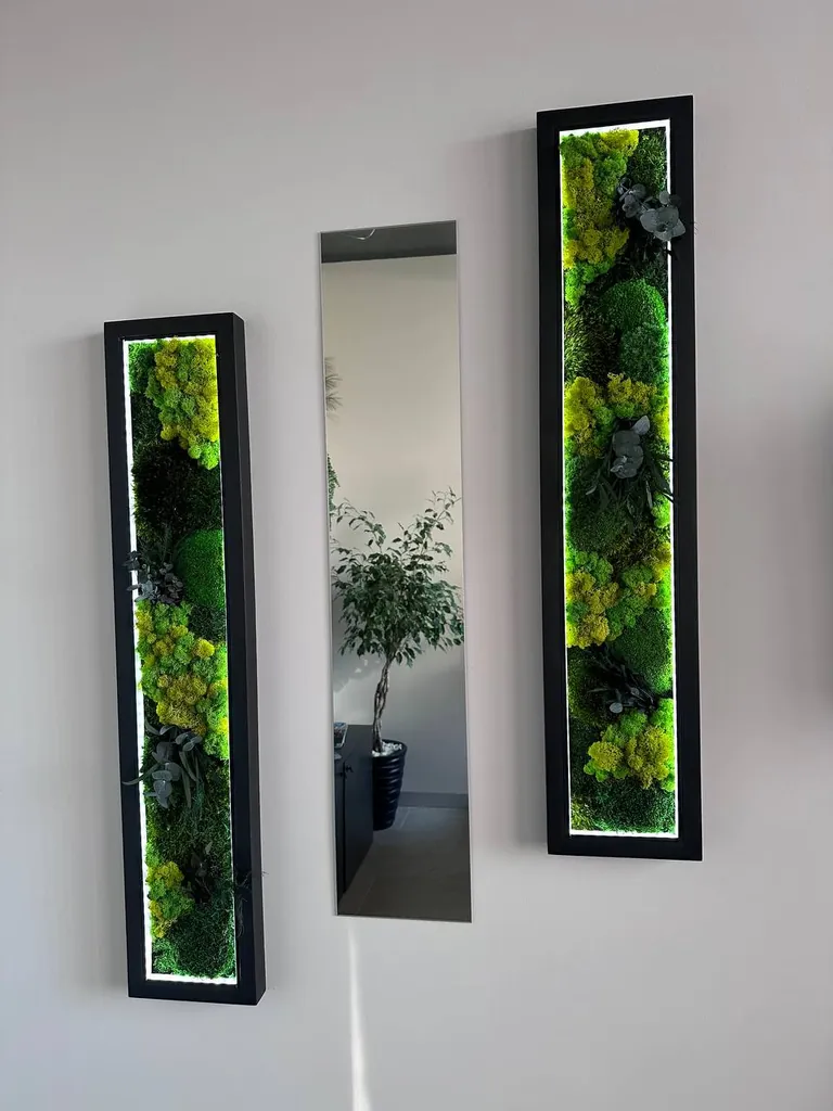 Set machových obrazov a zrkadlo je dokonalou kombináciou prírody a dizajnu, ktorá každému priestoru poskytuje jedinečnú a upokojujúcu atmosféru. Všestranné možnosti dizajnu, výber veľkostí a farieb rámov, ako aj integrované osvetlenie robia tieto umelecké diela ideálnou voľbou pre každý domov alebo kanceláriu. S minimálnou údržbou a maximálnym vizuálnym efektom predstavujú machové obrazy investíciu do štýlového a udržateľného bývania.