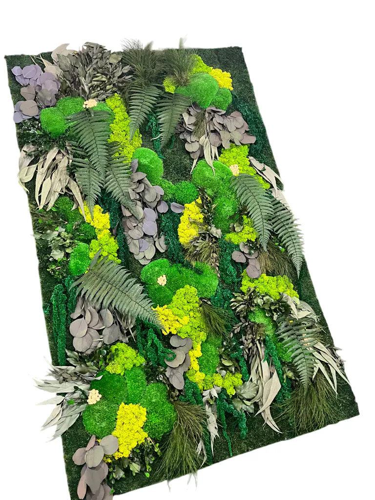 Naše panely s rastlinami sú symbolom udržateľného dizajnu. Základom je konzervovaný plochý mach, ktorý slúži ako “plátno” pre kompozíciu. Na tomto základe sú umiestnené ďalšie prírodné prvky ako listy, paprade a iné rastliny, ktoré sú taktiež konzervované. Táto technológia zaručuje, že si rastliny zachovávajú svoju farbu, tvar a textúru po mnoho rokov. Nevyžadujú polievanie, slnečné svetlo ani hnojenie. Sú hypoalergénne a bezpečné pre všetkých. Vďaka antistatickým vlastnostiam sa na nich neusádza prach, čo uľahčuje ich čistenie.